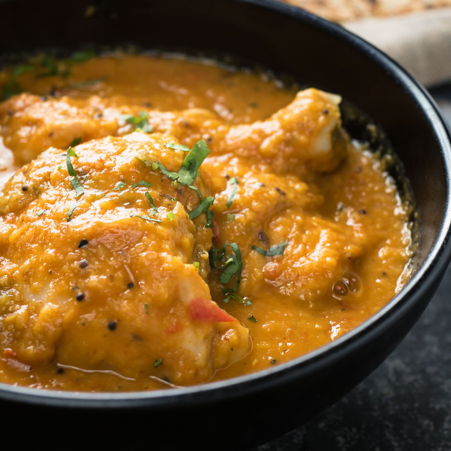 Chicken Cooked in a spicy lentil gravy. No bones.