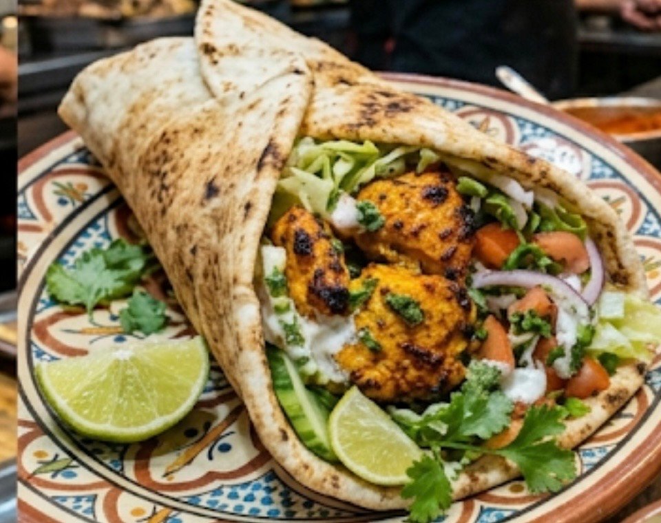 Marinated grilled Tandoori Fish with salad and pickles, layered in a tangy yogurt sauce. All wrapped in a light tortilla wrap.
