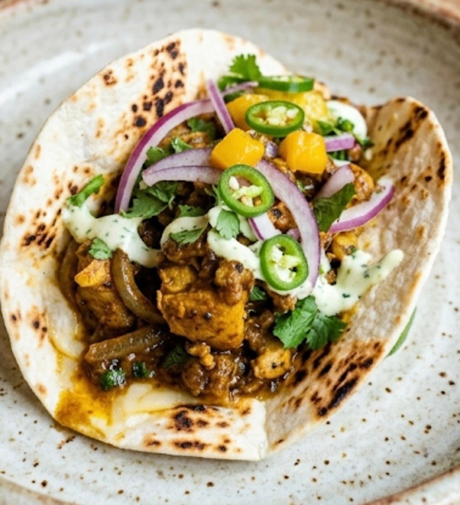 Marinated chicken breast in Madras spices with a tangy masala sauce on a bed of salad. Served in a soft tortilla.